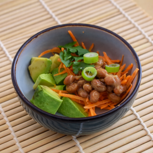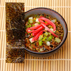 Découvrez notre sélection de délicieuses recettes à base de Natto. Essayez-vous à diverses préparations : simplement avec du riz rond et quelques toppings, comme les Japonais aiment le déguster au petit déjeuner, ou bien dans des recettes plus sophistiquées… Le Natto est déjà cuit et se consomme frais, il vient donc se marier sans préparation à vos diverses recettes.